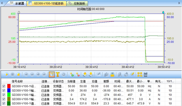 在實際運用中,接315KW電機測試,變頻轉工頻參數波形如下: