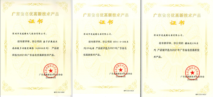 近日,“2021年廣東省名優高新技術產品”公布。英威騰“基于擴展技術高性能多功能變頻器(GD350系列)”、 “HT11 6-20K系列UPS電源”和“模塊化UPS系列”產品,通過資料審查、專家評選、公示等層層審核,成功入選。 而全深圳市也僅有76項產品入選。